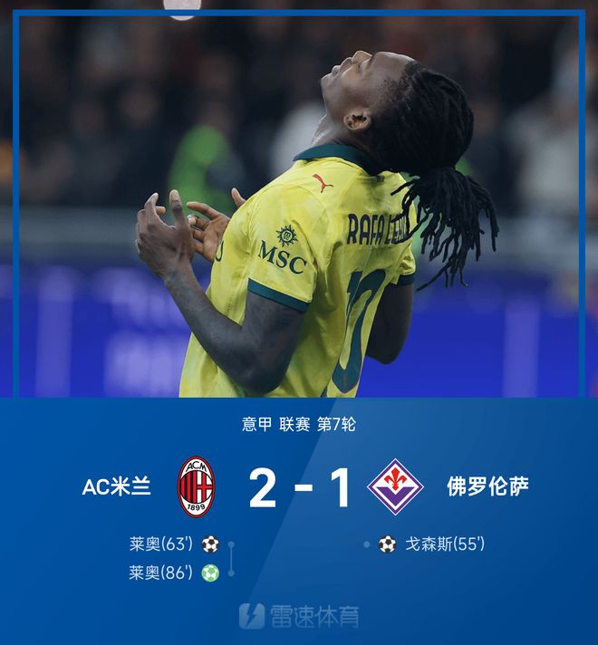 雷速体育10月20日讯 25/26赛季意甲联赛第7轮,AC米兰2-1战胜佛罗伦萨。上半场比赛两队互交白卷,下半场比赛戈森斯混战破门帮助佛罗伦萨首开纪录。随后莱奥远射破门扳平比分,比赛最后时刻莱奥点射破门梅开二度,帮助米兰成功完成逆转。