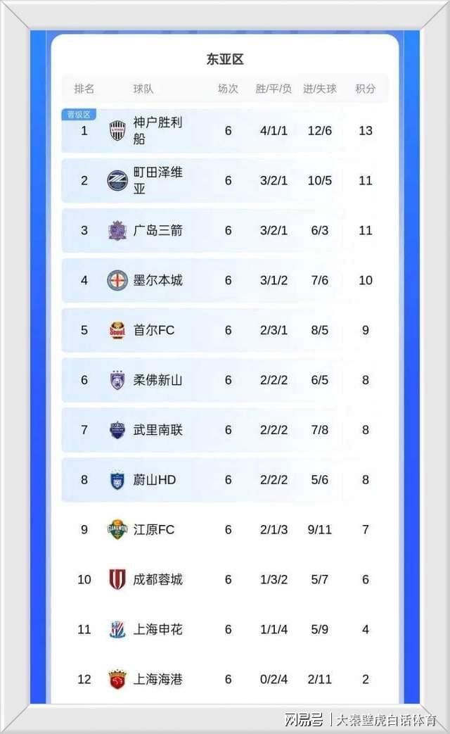 至此,第6轮精英联赛东亚赛区完整积分榜排名如下: